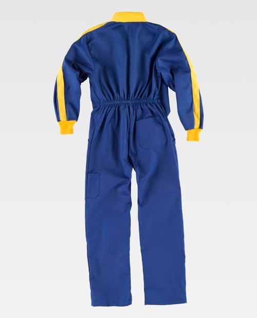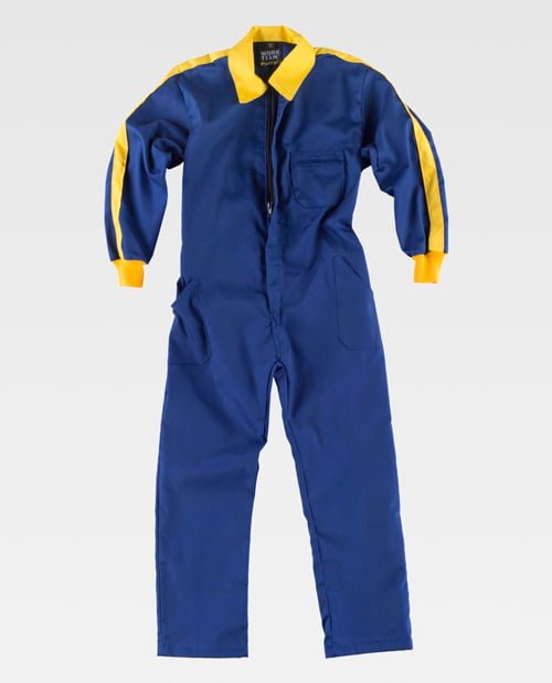 Buzo infantil combinado con cuello camisero y cierre de cremallera de nylon oculta, manga larga con puño elástico, un bolso de pecho de plastón con cremallera de nylon, dos bolsos de abertura inclinada en los costados, un bolso trasero de plastón y un bolso de espátula, elástico en la espalda y cuello, tira de manga y puños combinados.